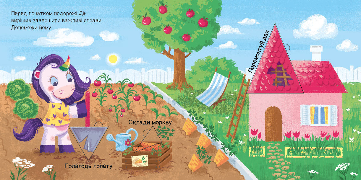 Серія книг "Шукаємо з єдноріжком" створена для дітей, які тільки знайомляться з геометричними фігурами та вчаться їх знаходити в навколишньому світі. Щоб допомогти єдноріжку Діну виконати всі завдання, малюкові знадобляться фігури різного розміру. Їх дитина знайде тільки відкривши книгу. А потім почнеться захоплююча гра, в якій потрібно буде: шукати, підбирати і правильно використовувати ці фігурки.