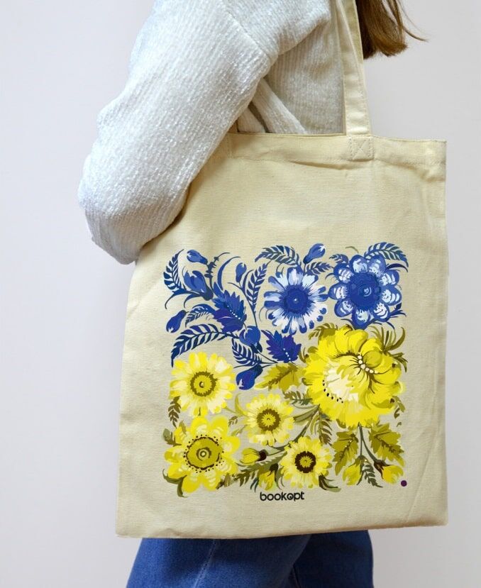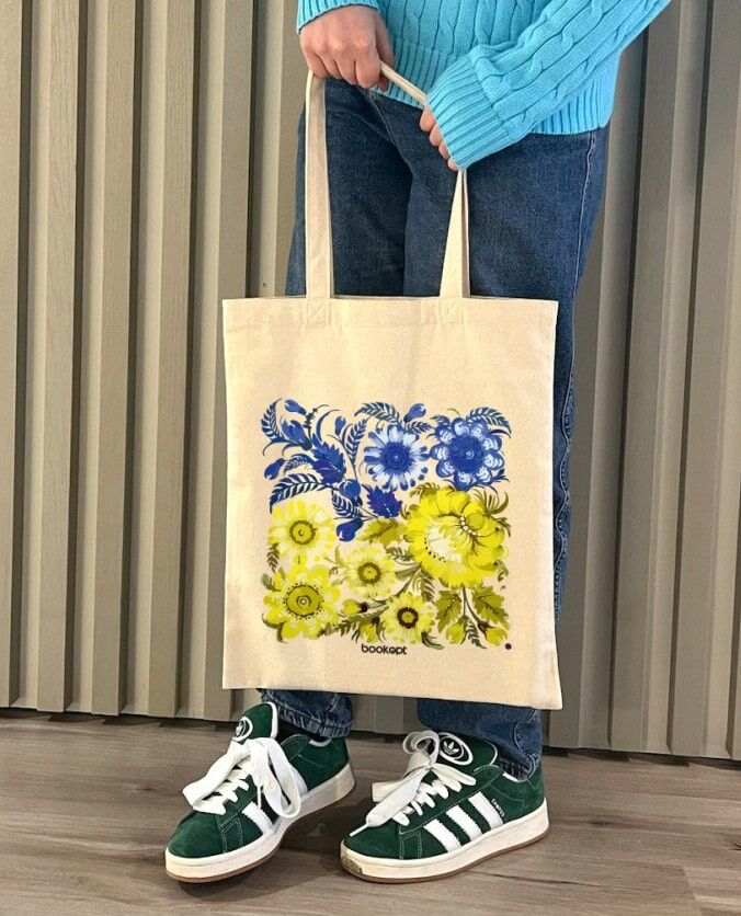 Екошопер бежевий «Петриківський розпис. Синьо-жовті квіти»