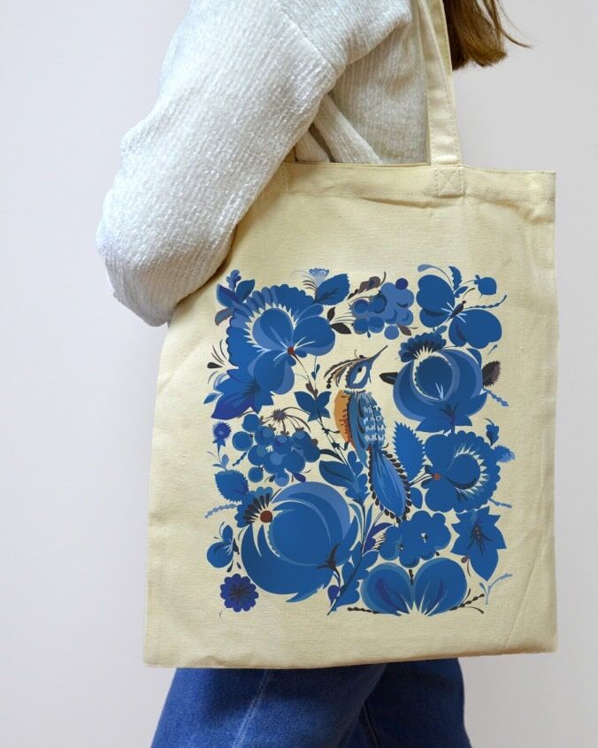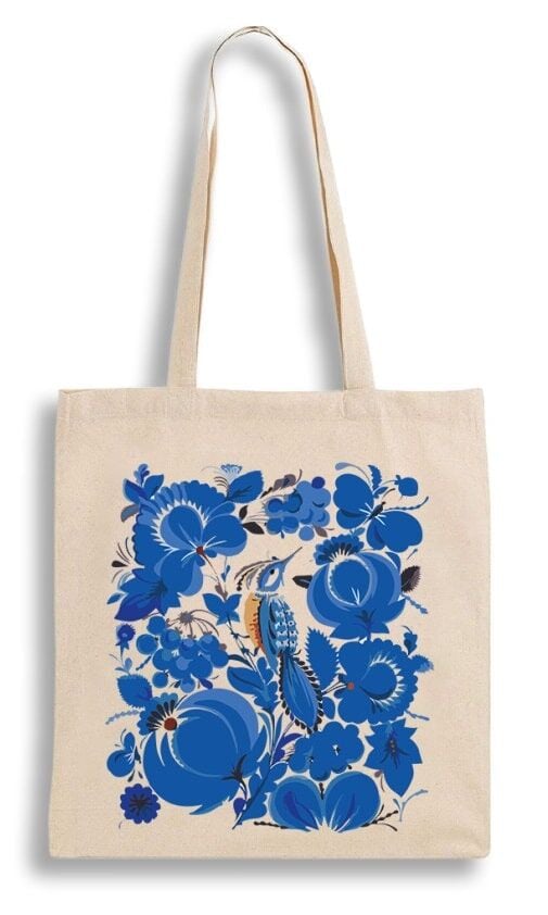 Екошопер бежевий «Петриківський розпис. Сині квіти»