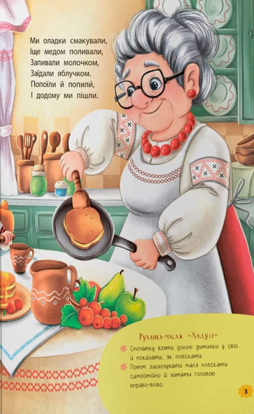 Коли малюк трохи підросте, ви зможете обговорити малюнки, вивчити напам'ять веселі віршики з іншої частини збірки, а також виконати розвивальні завдання до них. Почніть з найпростішого: промовляючи за малюка фразу, запропонуйте запам'ятати та повторити окремі слова. Проказуючи їх, дитина навчиться чітко вимовляти звуки, і це стане першим кроком на шляху розвитку мовлення. Згодом маленький чомусь непомітно для себе вивчити і зможе розповісти спочатку кілька рядків, а потім і весь вірш.