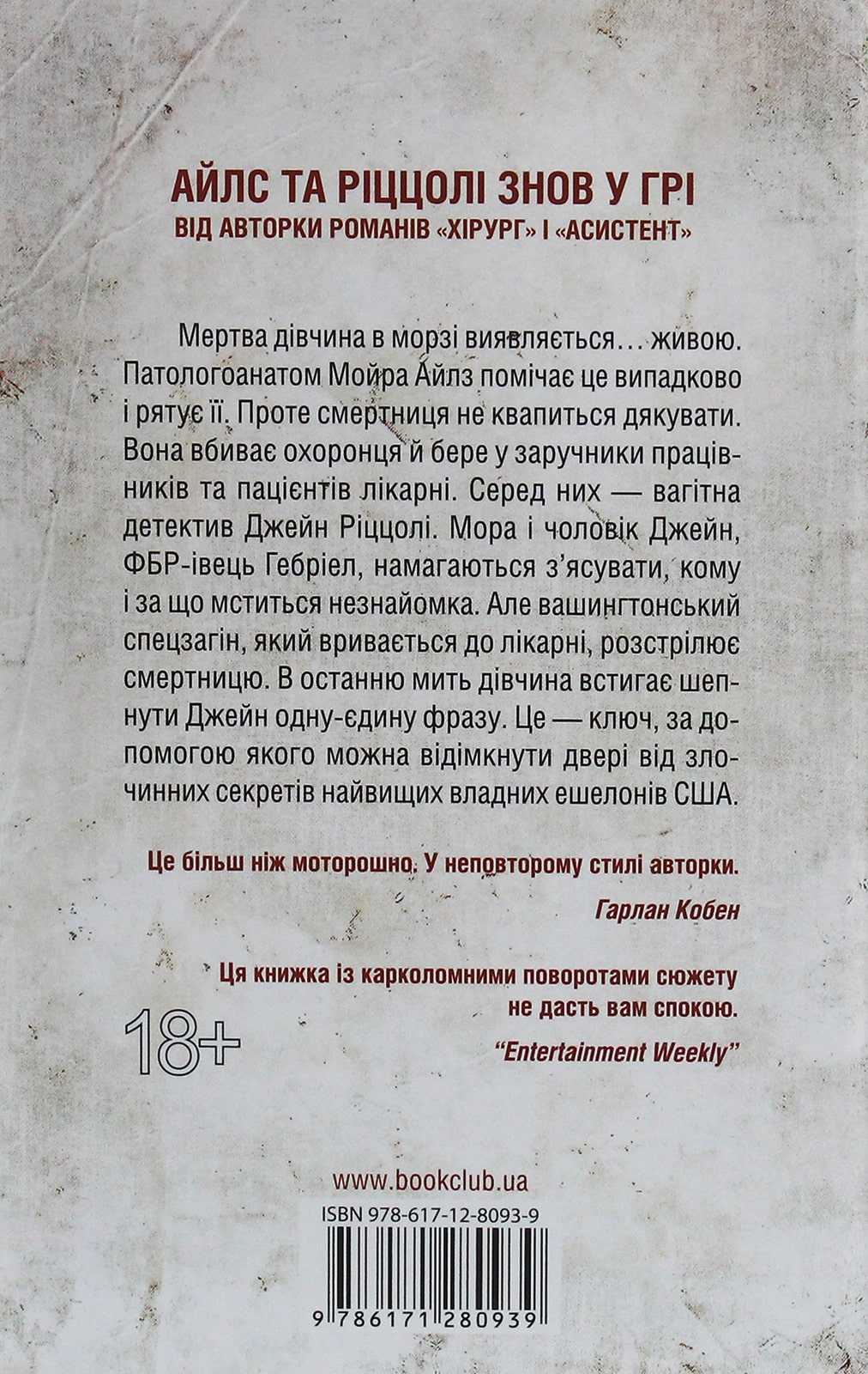 Мертва дівчина в морзі виявляється… живою. Патологоанатом Мора Айлз помічає це випадково і рятує її. Проте смертниця не квапиться дякувати. Вона вбиває охоронця й бере у заручники працівників та пацієнтів лікарні. Серед них — вагітна детектив Джейн Ріццолі. Мора і чоловік Джейн, ФБР-івець Гебріел, намагаються з’ясувати, кому і за що мститься незнайомка. Але вашингтонський спецзагін, який вривається до лікарні, розстрілює смертницю. В останню мить дівчина встигає шепнути Джейн одну-єдину фразу. Це — ключ, за допомогою якого можна відімкнути двері від злочинних секретів найвищих владних ешелонів США.