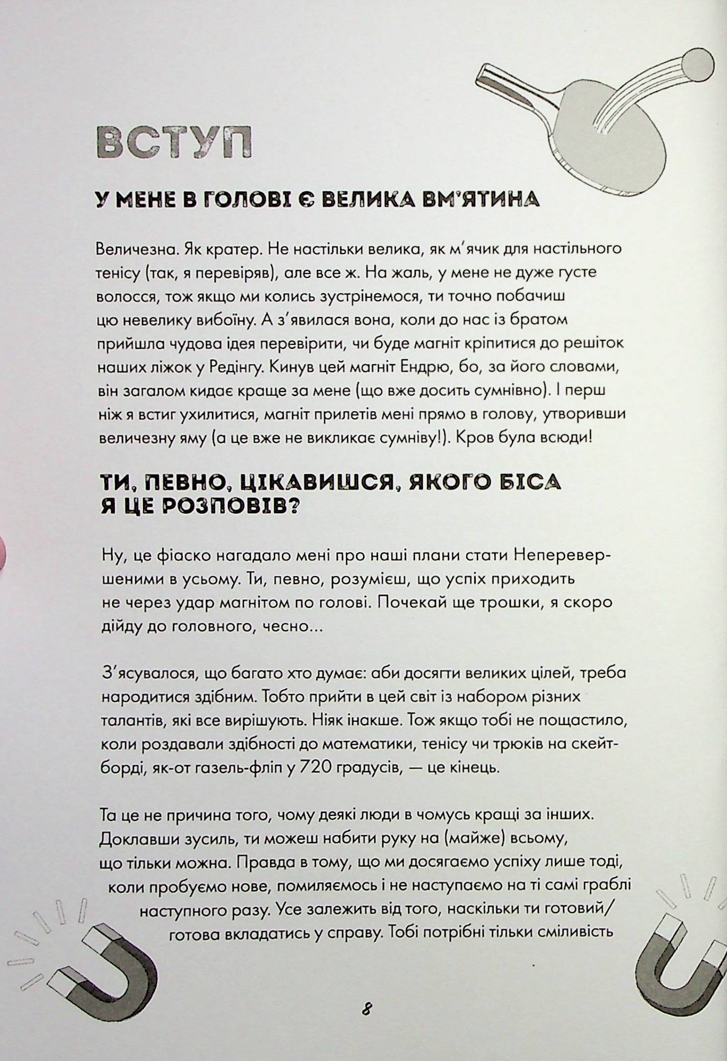 Цю книжку створила НЕПЕРЕВЕРШЕНА КОМАНДА: МЕТЬЮ САЄД — чемпіон з настільного тенісу й успішний письменник, МЕТТ ВАЙМЕН — бомбезний дядько і дитячий письменник, КЕТІ ВІКС — фахівчиня з трансформації способу мислення, а також неповторний ілюстратор ТОБІ ТРІУМФ.