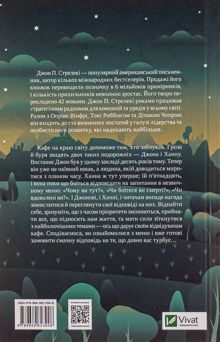 Затишна атмосфера кафе зі смачними стравами, запашним чаєм та комфортними диванчиками налаштовує на роздуми про важливе. Короткі, але потужні розділи-притчі та історії з життя написані легкою та доступною мовою і залишають по собі заспокоєння та легкість, а також потужну мотивацію рухатися уперед. У кафе Джона П. Стрелекі подають не просто поживу для розмірковувань, а справжні делікатеси, і читачеві обов’язково захочеться завітати сюди знову.