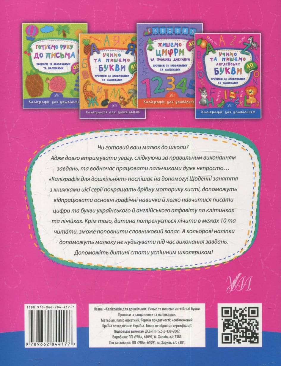 Чи готовий ваш малюк до школи? Адже довго втримувати увагу, слідкуючи за правильним виконанням завдань, та водночас працювати пальчиками дуже непросто… «Каліграфія для дошкільнят» поспішає на допомогу! Щоденні заняття із книжками цієї серії покращать дрібну моторику кисті, допоможуть відпрацювати основні графічні навички й легко навчитися писати цифри та букви українського й англійського алфавіту по клітинках та лінійках. Крім того, дитина потренується лічити в межах 10 та читати, зможе поповнити словниковий запас. А кольорові наліпки допоможуть малюку не нудьгувати під час виконання завдань.